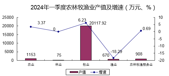 一季度,全州完成农林牧渔业总产值22923。92万元,按可比价计较,比上年同期增加5。04%,取上年持平;牧业产值20117。92万元,同比增加6。23%;渔业产值670万元,同比下降18。29%;农林牧渔办事业产值908万元,同比增加0。69%。